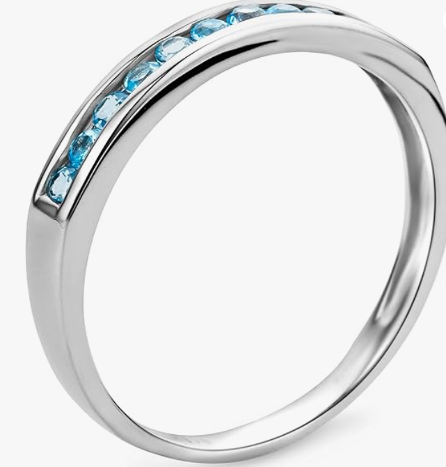 Women's Ring in Genuine 9KT 375 White Gold with Natural Round Blue Topaz Stones, 0.30 ct. Genuine Faceted Blue Topaz Eternity Ring. Hypoallergenic Band.